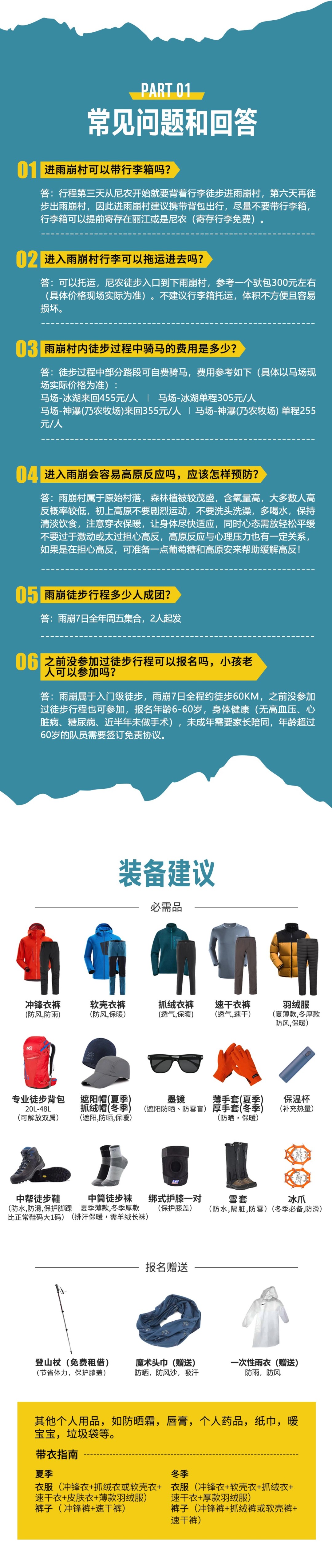 装备:登山杖1根(免费租借)、一次性雨衣1件(仅雨季免费提供)、魔术头巾1条;