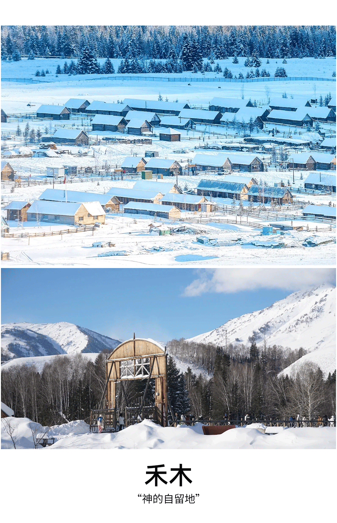 之后前往景区入住山庄,即可开始享受禾木的冬天。冬季的禾木银装素裹,白雪皑皑,一片白雪与灰色白桦林的映衬,显得那么安静与反差。没有了嘈杂的游客,它又回归到本就属于这里的静谧和纯净。登上禾木村头的小山,身边的雪花慢慢地飘动着,不远处的禾木村飘起袅袅炊烟,堆满积雪的小木屋就像童话中的小房子,山间忽而会有一群马儿走过,忽而又不知从哪儿隐入山林中,让人感觉身处世外仙境。此时此刻,我们可以感受图瓦人的生活与安逸,白雪皑皑的雪峰,悬崖边的雾凇“雪蘑菇”,茫茫苍苍的林海雪原……每一个角度,每一个小景,都让人怦然心动。