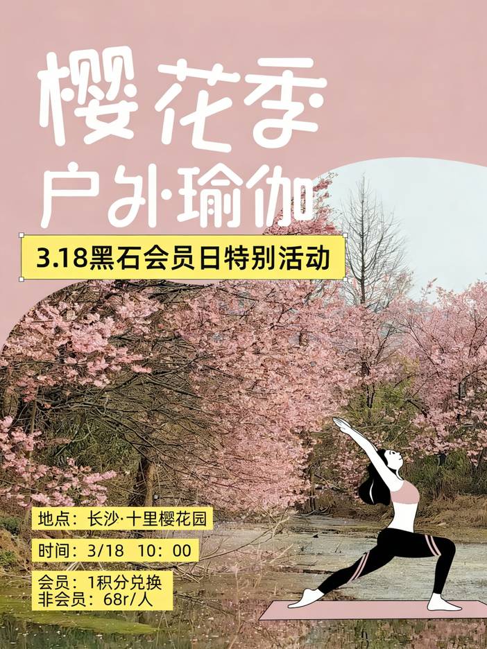 长沙的春天很短,短到一树樱花从盛开到飘落,不过七天。正因为短,才不忍辜负。3月18日,黑石会员日,我们不爬山、不赶路、不赶时间。我们只做一件事:把瑜伽垫,铺在樱花树下。🌸 🌸 🌸​你有没有试过,在花瓣雨里做一场瑜伽?不是隔着玻璃看花,不是匆匆路过拍一张照就走。是当你站在垫子上,调整呼吸的那一刻,一阵风恰好经过,花瓣不是飘落,而是洒下来——落在你的发梢,落在你的肩头,落在你向前伸展的指尖。这是2026年...